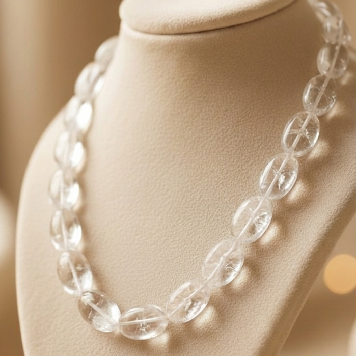 A clear quartz necklace, known as the Universal Crystal, radiates versatile and amplifying energy. It is believed to enhance clarity, boost stamina, and support overall healing. Many wear it to magnify intentions and promote spiritual and personal growth. Its pure, clear presence helps balance and align energies, fostering focus and insight. Worn close to the heart, it serves as a powerful companion for mindfulness, vitality, and self-empowerment. Material: 100% Natural Clear Quartz (Crystal) Beads Color: Transparent Crystal Clear Uses / Benefits: Amplifies energy, focus, and intention Promotes emotional clarity and inner peace Enhances healing and meditation practices Balances all chakras and protects against negativity Ideal for daily wear, meditation, or gifting