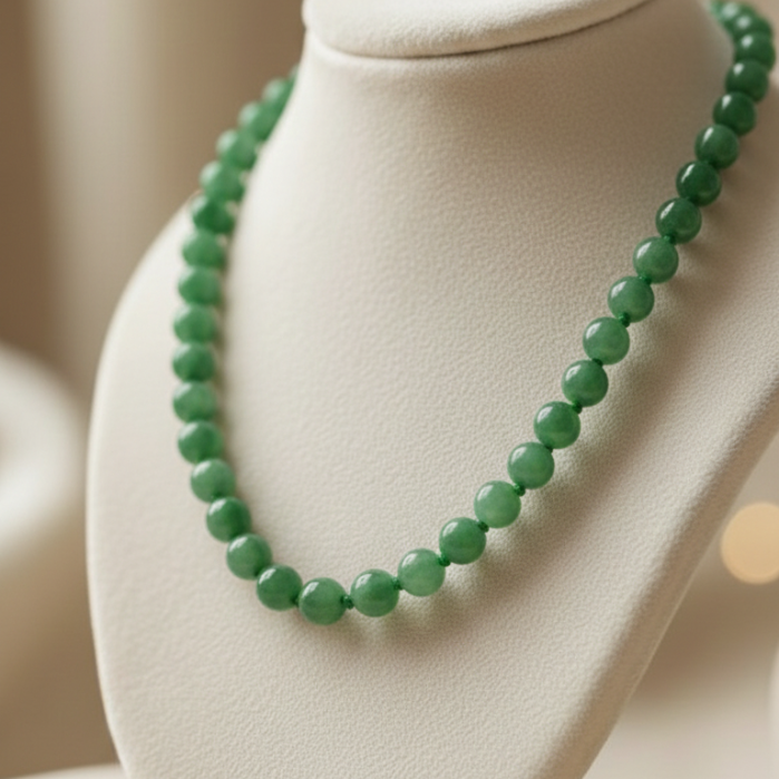A green aventurine necklace embodies the energy of opportunity, optimism, and new beginnings. Often regarded as a stone of luck, it is believed to support prosperity, success, and steady personal growth. Its gentle vibration helps release old patterns, making room for fresh possibilities to flourish. Many wear it to cultivate confidence, positivity, and an open heart. Close to the heart, this necklace invites good fortune, forward momentum, and a sense of harmonious balance into daily life. Material: 100% Natural Green Aventurine Stone Beads Color: Soft to Medium Green with Natural Variations Uses / Benefits: Brings luck, prosperity, and new opportunities Encourages emotional healing and heart chakra balance Promotes calmness, confidence, and creativity Supports decision-making and leadership qualities Ideal for daily wear, meditation, or gifting